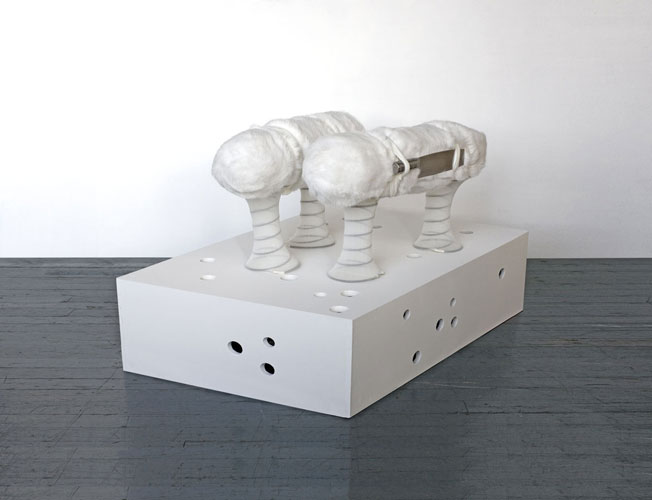 , 2008, aquaresin, rabbit fur, coil springs, tights, knifes, MDF, paint 22”x24”x36”.