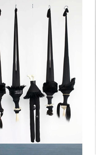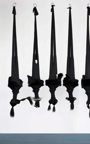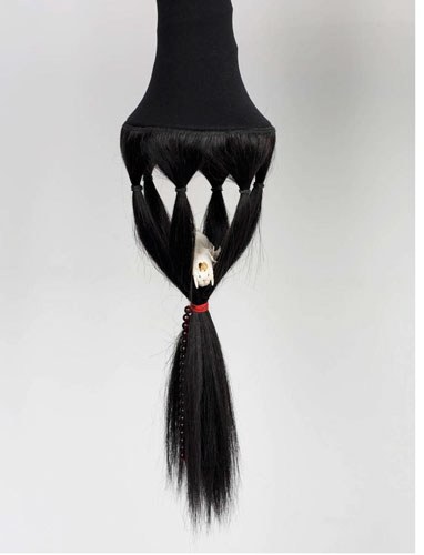 , 2010, coil springs, metal, tights, hair, fur, beads, skulls, feathers, polyester resin, 94” x 104” x 15”.