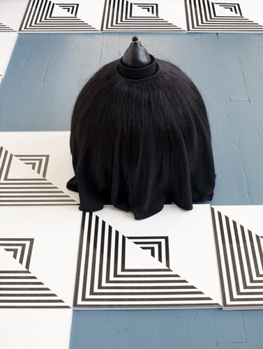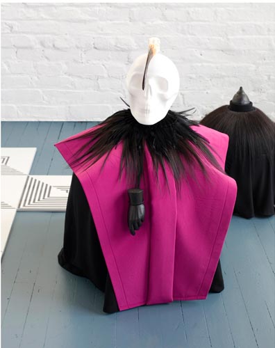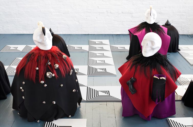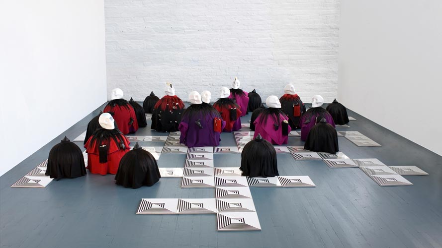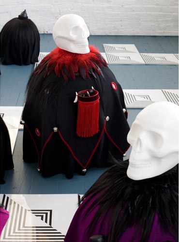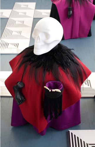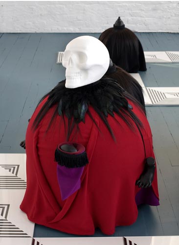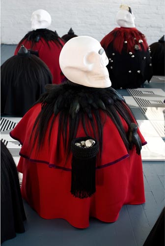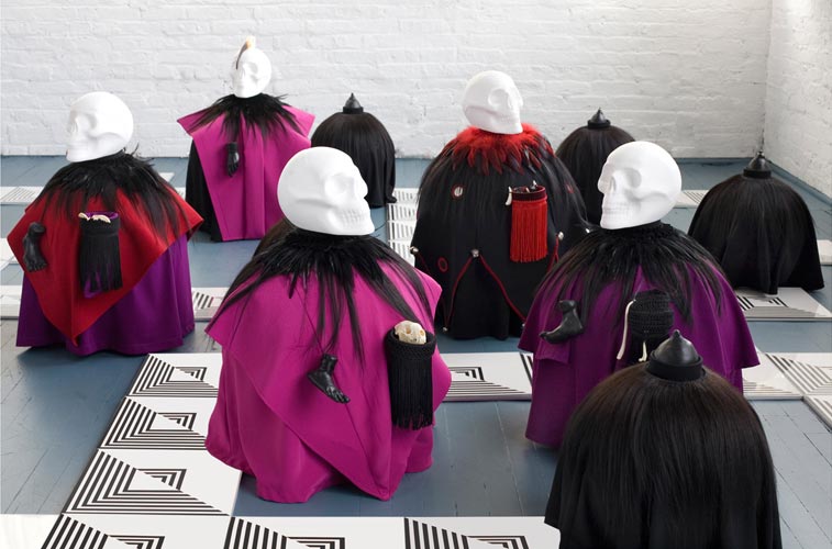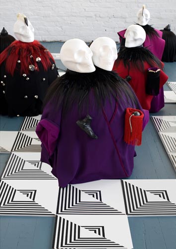 polystyrene, fabric, paint, clay, hair, tights, bones, teeth, skulls, feathers, leather, plastic, bells; drawings (ink/paper), mdf, plexi glass/app. 236"x168"x29".