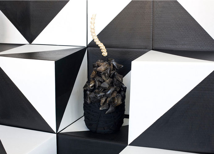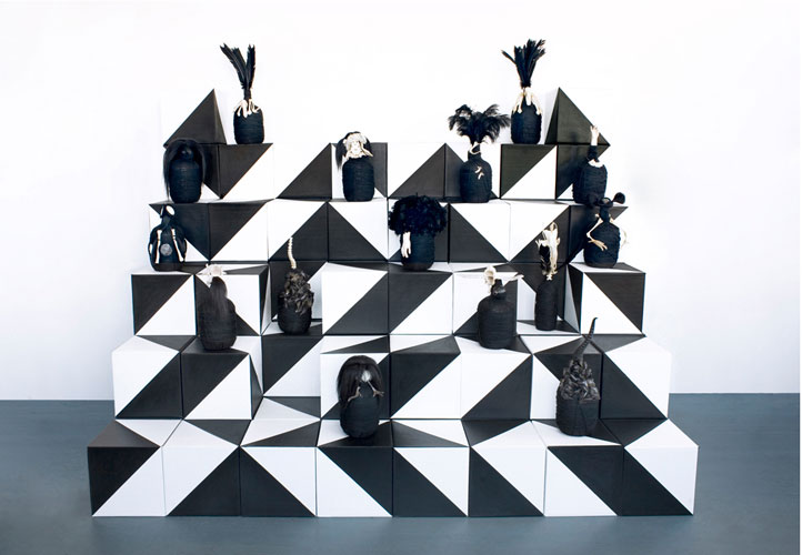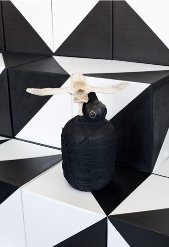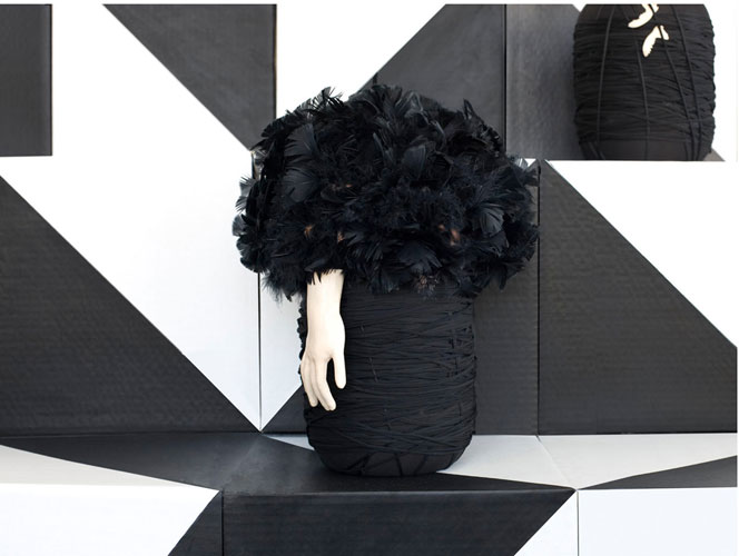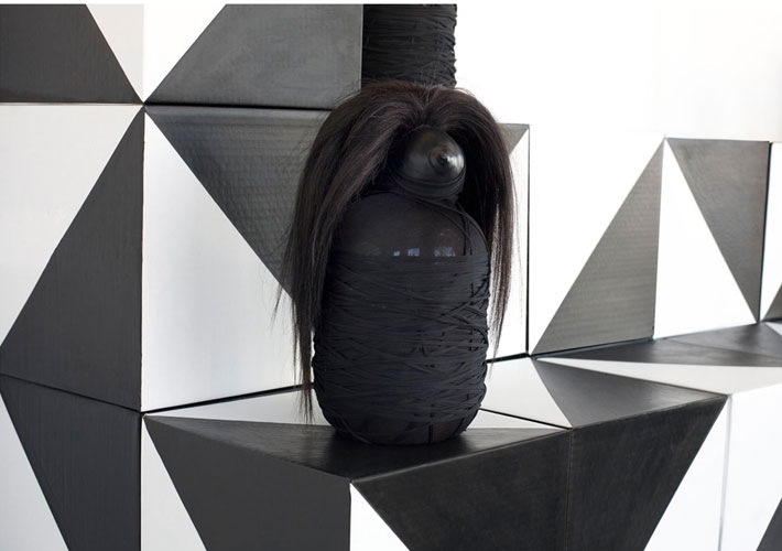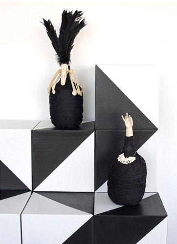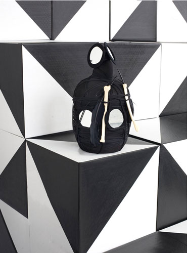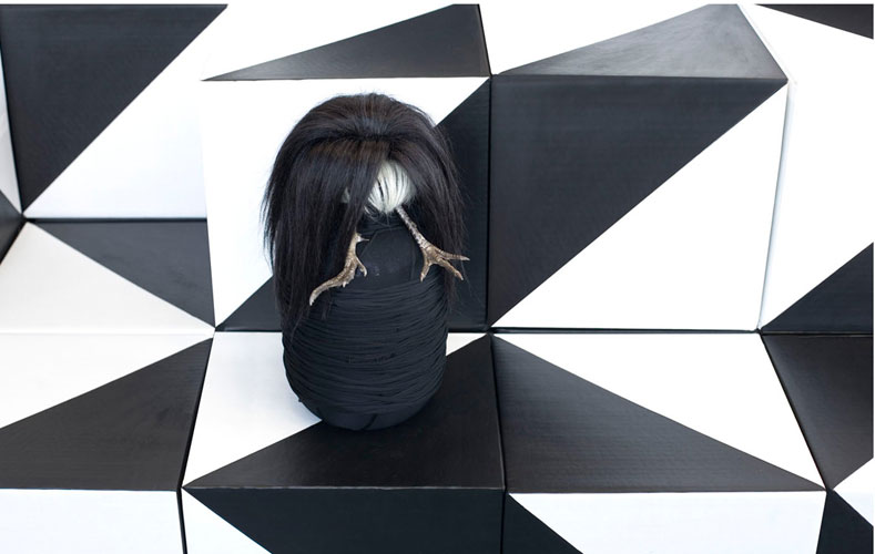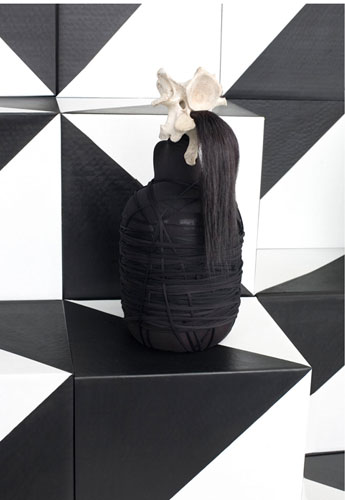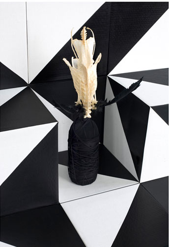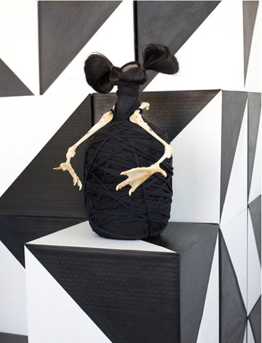 , 2011, bottles, tights, clay, plaster, paint, bird skeleton , feathers, bones, teeth, mirrors, hair, horn, card board, 7' x 8' x 5'.