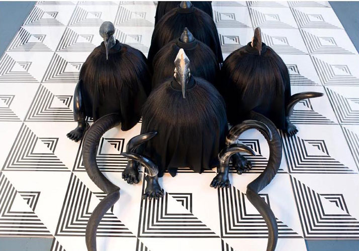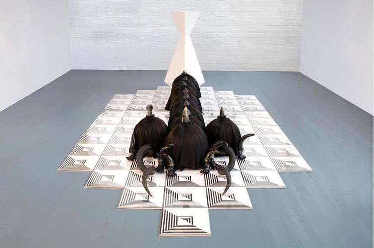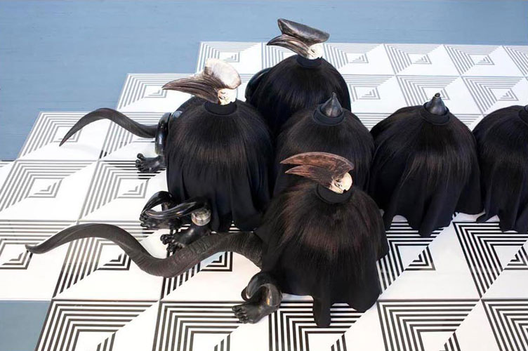 , 2011, 63 drawings (ink on paper), MDF, paint, plexi glass, polystyrene, fabric, tights, hair, clay, metal, bird skulls, horns, 4'x15'x7'.