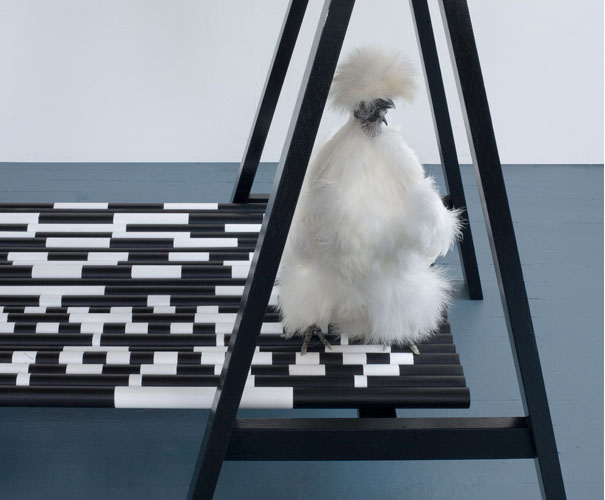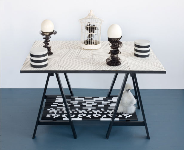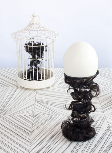 , 2013, wood, paint, drawings (pencil on paper), mdf, leather, metal, hair, ostrich eggs, taxidermy chicken, 42"x36"x48".