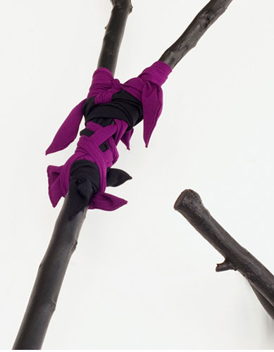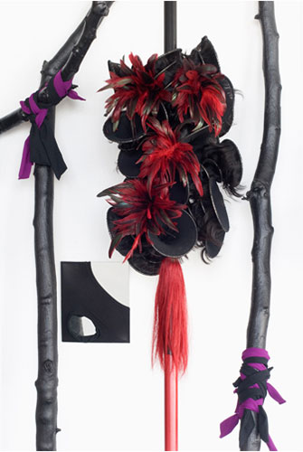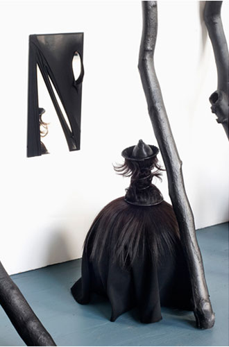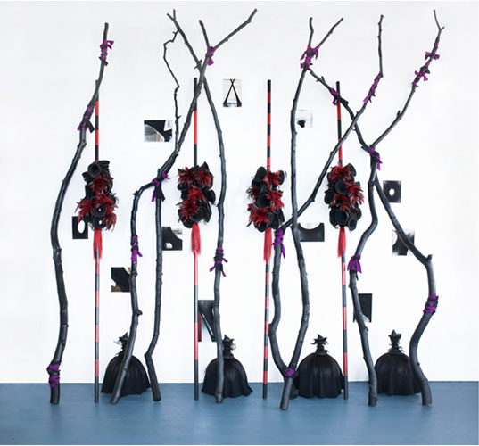 , 2013, branches, paint, fabric, tights, hair, mirrors, feathers, fur, coil springs, polystyrene, clay, 130"x 140"x 34".