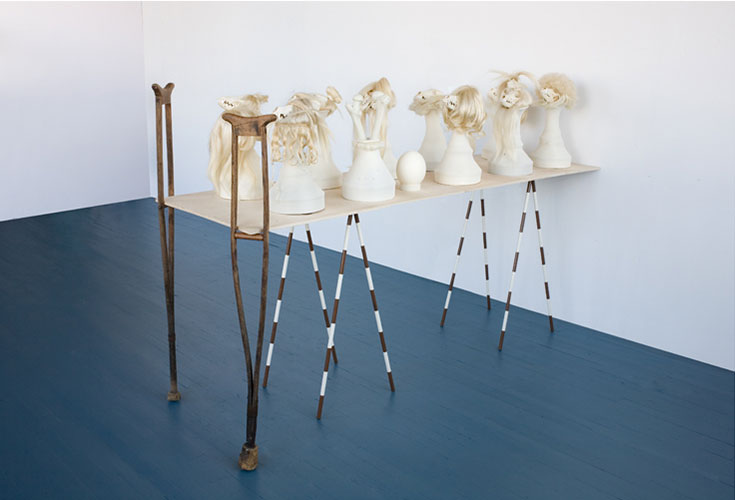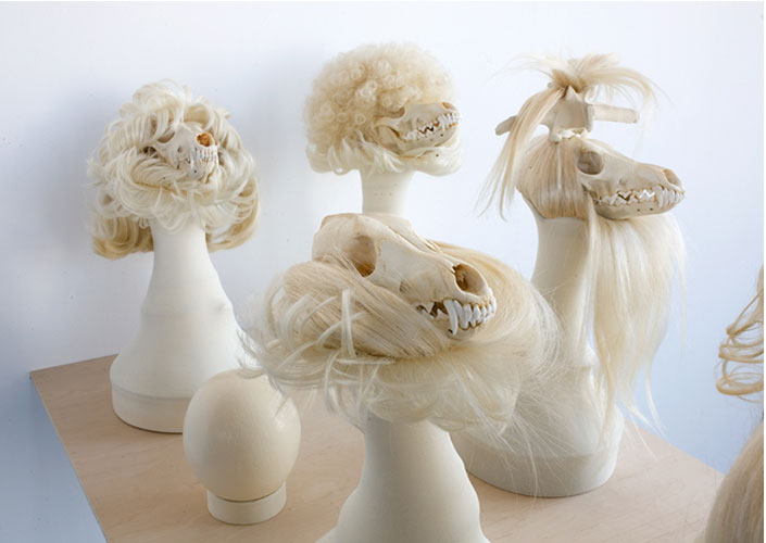 , 2013, plywood, wood, metal, paint, coil springs, tights, hair, skulls, bones, resin, 53" x26" x 82".