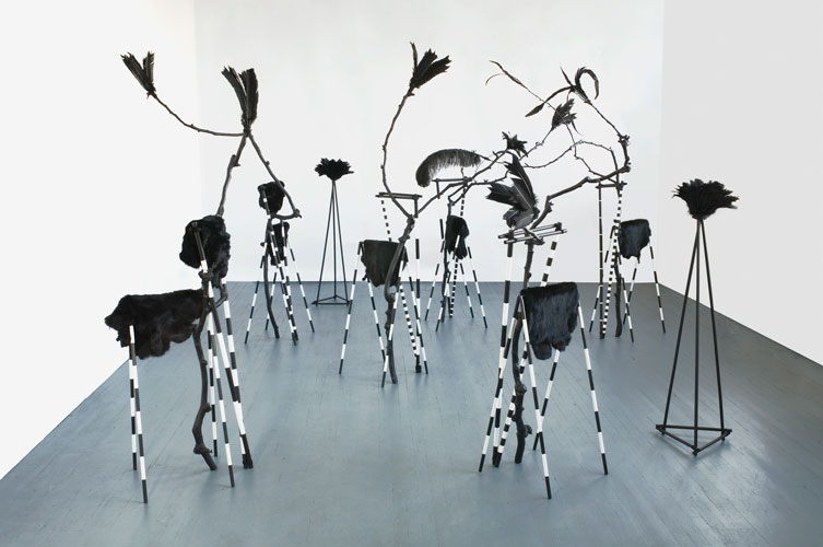 Maze for a Zebra, 2011, metal, wood, branches, paint, rabbit fur, feathers, variable dimensions. All images © Nina Lola Bachhuber 2020
